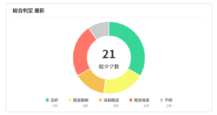 ダッシュボード内の総合判定最新(図3)は全バルブ診断台数における最新の各判定割合を示している。また、総合判定推移(図4)は、各判定結果の過去から現在の件数推移を示している。この2つの図で、ユーザーは診断対象バルブ全体の状況把握と、その状態変化の推移が一目で確認できる。