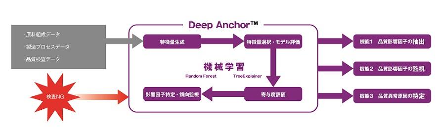Deep AnchorTMは、「自律型品質管理コンセプト」に基づいて開発された、AIを活用した品質管理分野のナビゲーションシステムです。この革新的なAIシステムは、製品の品質に影響を与える因子を自動で抽出し、生産中の因子をモニタリングします。また、万一品質検査で不合格となった場合には、自動的に原因を調査する機能も備えています。