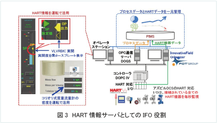 2つ目の役割は、従来のアナログ4-20mA信号ではDCSに入力されていない現場機器が保持している運転に有益なHART機器データをDCSオペレーションで活用可能とすることである。InnovativeField Organizerでは接続している全てのHART機器から最大8個までの変数を毎秒収集しており、これらの変数をDCSで活用することが可能となる。(図3)